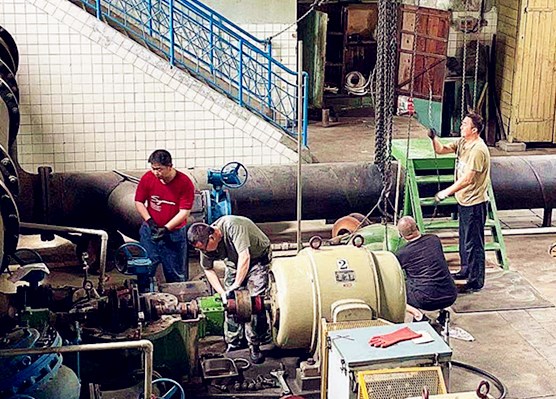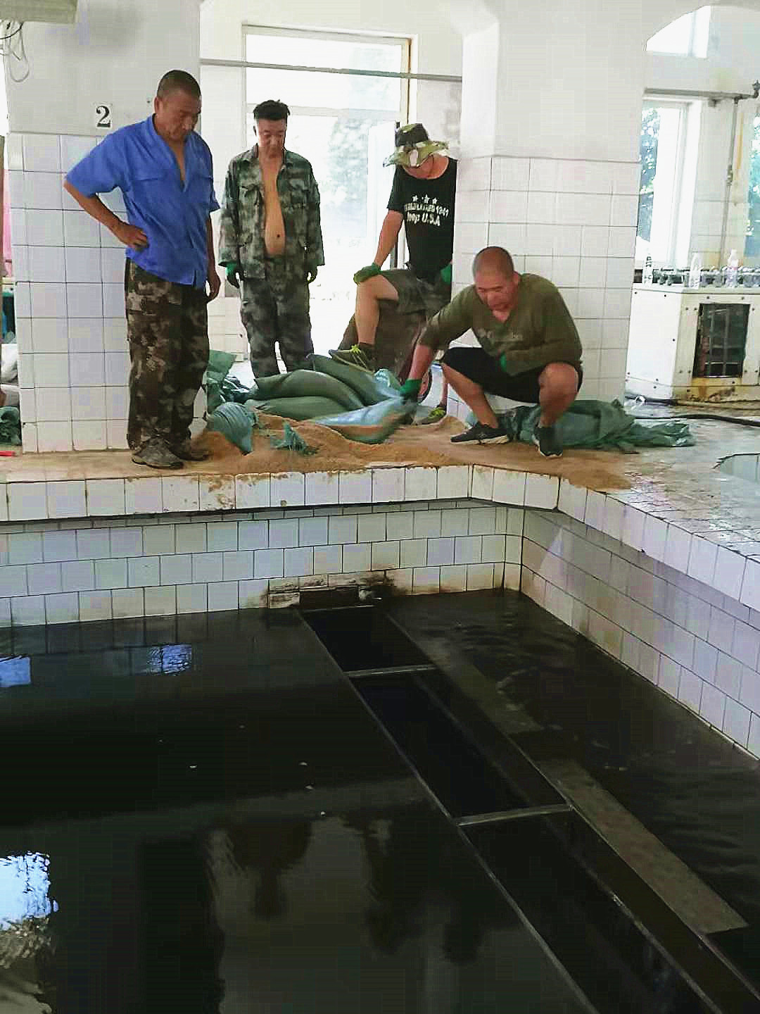 四道溝水源為保證水質(zhì),汛期前對反應(yīng)池沉淀池進行清淤工作,對一級泵站設(shè)備進行維護保養(yǎng)大修。由于四道溝水源江心井吸水籠頭損壞,不能有效攔截江中雜物,致使一級泵站取水水泵經(jīng)常堵塞,值班員和維修人員只能打開泵蓋進行人工清掏,最多時每天清掏3次。由于四道溝、SW新運轉(zhuǎn)泵站運轉(zhuǎn)車間內(nèi)機組運行散發(fā)熱量,致使車間內(nèi)溫度高于室外,最高時達到40度,值班員只能強忍高溫,對設(shè)備進行操作和維修。維修班更是頂著炎炎烈日完成日常維修,更換接梨樹泵站4號機組DN150出水水門、更換損壞的接觸器、檢修四道溝水源一泵站3號機組DN300出水水門。