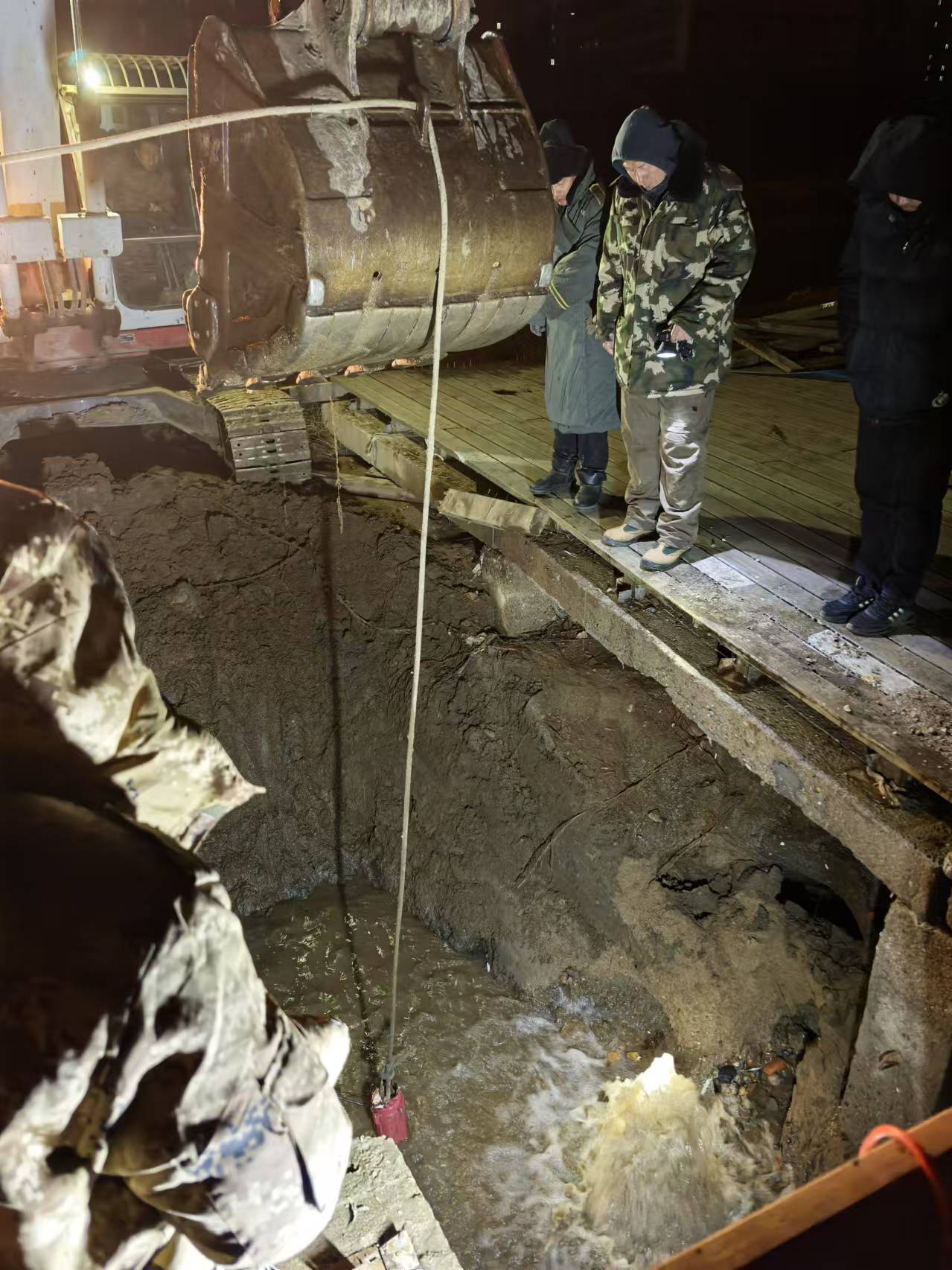 搶修人員進(jìn)入施工現(xiàn)場(chǎng)后,通過仔細(xì)勘察確定維修方案,隨即展開接電、排水、挖掘土方等維修工作。由于主管線位于地下5米多深的砂石土質(zhì),挖掘時(shí)又多次出現(xiàn)塌方,施工一度受挫。為縮短搶修時(shí)間,盡快恢復(fù)供水,我處先后將4個(gè)維修隊(duì)調(diào)入施工現(xiàn)場(chǎng),輪番上陣。搶修人員在深夜靠著應(yīng)急燈照亮,冒著零下四五度的低溫,在冰冷的泥漿中爭(zhēng)分奪秒、連續(xù)奮戰(zhàn),經(jīng)過15個(gè)小時(shí)的奮力搶修于次日早上7點(diǎn)30分恢復(fù)供水。